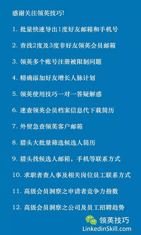案例12: 领英加好真的很简单吗? 二月 26, 2019 在领英,邀请(俗称加人)是我们与他人建立联系的方式。一名领英会员首先发送邀请,当对方接受邀请后,两人即成为 1 度联系人。如邀请对象并非领英会员,系统将提示对方加入领英,接受邀请。每建立一个新的联系人,我们的人脉网都可能增加数千位专业人士。 在完成 案例11: 增USA Data Analysis人脉圈 时候,讨论了下领英加好友的注意要素,因为每次添加好友前都是要首先明确好客人的需求,账号用途,加人方向,然后我们制定计划和完成时间等。 新账号加好友也不是简单一步就能达成,在沟通完具体加人方向后,我们还要考虑多个因素,遵守规则,避免雷区,直到最终完成目的。这个时候就需要点领英技巧。 ●我们 不违反领英的规则避免账号被永久限制 领英建立了《职业社区政策》,规定了领英允许的讨论和内容范围,以及哪些情况会被认定为不当而被领英限制帐号或删除内容。如果领英确定您的帐号或以该帐号发布的内容违反了《职业社区准则》或《用户协议》,领英可能会删除该内容或对该帐号设限。根据违反严重性的不同,您的帐号可能会无限期受限。 以下行为或活动示例可能会导致帐号受限: 1. 帐号出现异常高的访问量。 2. 帐号职业档案中使用的名字违反了领英的《用户协议》。 3. 领英已检测到帐号存在不当或非法活动。 4. 帐号有大量的辱骂行为记录。 5. 领英已检测到帐号可能被黑客入侵或破坏。 (注: 如果您注册的账号一直被限制,想拥有领英账号,我们可以帮您解决这个问题,请联系我们。) ●我们 不造成账号搜索限制(避免商业用途上限) 如果提示账号达到了商业用途搜索上限,搜索结果只显示3个可见,其他的都是模糊无法查看,这是因为领英检测到您的活动可能将领英用于商业用途,例如招募人才或找工作或大量流量信息。 接近上限时,我们会收到领英的commercial limit提醒。每月 1 号的太平洋标准时间午夜,当月的免费搜索用量将重新恢复。领英无法显示准确的剩余搜索量或查看次数,也无法接受提高上限的请求... 阅读全文